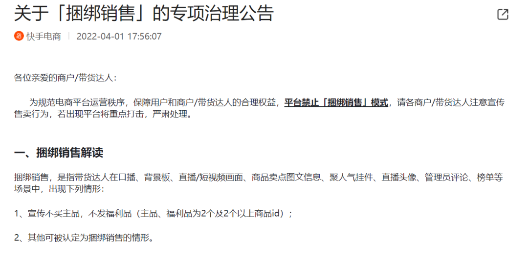 新榜讯 4月1日,快手电商发布《关于「捆绑销售」的专项治理公告》,公告称,平台将禁止“捆绑销售”模式。